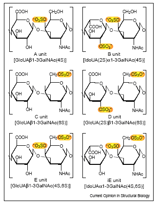 Рис.4. Структура линкерного района кератансульфат протеогликанов 1.6 Гиалуроновая кислотаПовторяющаяся дисахаридная единица гиалуроновой кислоты - GlcNAc-GlcUA. ГК широко распространена в природе, от капсул Streptococcus дотканей беспозвоночных и позвоночных организмов [3]. У млекопитающих ГК присутствует в коже, скелетной ткани, стекловидном теле глаза, пупочном канатике и синовиальной жидкости [4]. Типичный полимер может содержать 104 дисахаридных единиц (от 105 до107 Да) [5]. В растворе ГК имеет вытянутую структуру - будучи растянутым, полимер 106 Да имеет длину около 2 мкм. Благодаря своей длине, молекулы ГК стремятся образовать запутанную ситоподобную структуру. При концентрации 10 мг/мл вязкость (η) ГК составляет 5000 (т.е. в 5000 раз превышает вязкость воды), что придает упругость тканям, в которых гиалуроновая кислота присутствует в высокой концентрации (гребень петуха, стекловидное тело и др.). ГК является биологическим любрикантом - уменьшает трение при движении и обеспечивает упругость в статических условиях, участвует в поддержании гомеостаза воды, является своего рода фильтром и регулирует распределение белков плазмы [3]. Поскольку ГК имеет однородную структуру, может показаться, что она не принимает участия в специфических взаимодействиях. Однако это не так: обнаружена группа белков (гиаладгеринов), специфично узнающих структуру ГК. Такого типа взаимодействия связывают ГК с протеогликанами, стабилизируя структуру внеклеточного матрикса, и с клеточными поверхностями, изменяя поведение клеток [3]. Биосинтез ГК представляет собой кополимеризацию GlcNAcи GlcUA, донорами которых выступают высокоэнергетические нуклеотидные предшественники: UDP-GlcNAcи UDP-GlcUA, соответственно. В отличие от остальных гликозаминогликанов, ГК никогда ковалентно не присоединяется к белку. Биосинтез ГК происходит в плазматической мембране, что является исключением из правила, гласящего, что гликозилирование осуществляется в аппарате Гольджи [5, 6]. Катаболизируется ГК в лизосомах после рецептор-опосредованного эндоцитоза, на месте или же (после транспорта с током лимфы) в лимфатических узлах, где деградируется основная доля ГК [3]. 1.7 Хондроитинсульфат протеогликаныХондроитинсульфаты представляют собой линейные полимеры, состоящие из повторяющихся дисахаридных единицGalNAc-GlcUA. В составе ДС-цепей присутствуют также остатки IdoUA (вместо GlcUA) в различных пропорциях. Количество дисахаридов в составе ХС-цепи варьирует от 40 до 100 и более штук. Выделяют 6 классов ХС, в соответствии со структурой дисахаридных единиц: ХС А, ХС В (ДС), ХС С, ХС D, ХС Е и ХС iE (i-идуроновая кислота) (рис.5).
