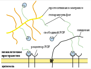 Большинство белков связывается с ГС, которые являются наиболее химически гетерогенным классом ГАГ. ГС взаимодействуют с белками специфическими участками ГАГ с определенным паттерном сульфатирования остатков сахаров [21]. Эти взаимодействия имеют глубокий физиологический эффект. Примером может служить введение в кровяное русло гепарина, приводящее к быстрому антикоагуляционному эффекту, благодаря связыванию и активации антитромбина. Связывание ГАГ с лигандами может приводить к (1) иммобилизации белков в месте их продукции, (2) регулированию ферментативной активности, (3) присоединению к сигнальному рецептору, (4) защите лиганда от деградации, (5) резервированию лигандов [25, 26]. Протеогликаны найдены во всех исследованных тканях многоклеточных беспозвоночных и позвоночных животных. Протеогликаны известны в основном как компоненты внеклеточного матрикса, включая хрящ, базальную мембрану и соединительную ткань. Они также широко представлены на клеточной поверхности (мембранные ПГ). А также ПГ могут запасаться внутри клетки в секреторных гранулах. Протеогликаны внеклеточного матрикса в основном содержат ДС/ХС цепи ГАГ [27], тогда как ПГ на поверхности клеток в основном представлены ГСПГ [28]. Все эпителиальные ткани экспрессируют протеогликаны клеточной поверхности, преимущественно глипиканы (ГС) и синдеканы (ГС/ХС) [29]. По локализации протеогликаны клеточной поверхности могут быть трансмембранными белками (синдеканы), могут быть связаны с липидами плазматической мембраны через фосфатидилинозитол (глипиканы) или секретироваться в базальную мембрану (перлекан, агрин). Коровый белок синдекана имеет протяженный трансмембранный домен и короткий (34-38 аминокислотных остатков) С-концевой цитоплазматический домен. Коровый белок глипикана имеет глобулярную структуру, стабилизированную дисульфидными связями, и заякорен в плазматической мембране через фосфатидилинозитол. Доказательства, что мембранные ПГ могут ферментативно высвобождаться из мембран, пока нет. Однако есть предположение, что такое высвобождение имеет место in vivo и осуществляется фосфоинозитол-специфичной фосфолипазой С. Базальные мембраны тканей млекопитающих содержат перлекан и агрин. Перлекан присутствует в большинстве базальных мембран, а также в хряще, в то время как агрин является компонентом базальных мембран в мышцах, нервномышечных соединениях, центральной нервной системе, легких и почках. Оба протеогликана являются крупными мультидоменными молекулами, несущими цепи гепарансульфатов ближе к N-концу корового белка [30]. Протеогликаны обнаружены также в ядрах, где, как установлено в ряде случаев, связаны с транскрипционно активной частью хроматина [31, 32]. Протеогликаны внеклеточного матрикса формируют его структуру за счет взаимодействий с различными внеклеточными макромолекулами. Во внеклеточном матриксе ПГ взаимодействуют с ламинином, фибронектином [33], коллагеном I [34]. Известно, что декорин связывается с коллагеном I, II [35], IX [36], причем как в эмбриональных тканях, так и в тканях взрослого человека [36]. Фибромодулин, так же как и декорин, связывается с коллагеном Iи IIи влияет на фибриллогенез коллагена [25, 37], тогда как бигликан коллаген не связывает, но его большое количество было обнаружено во внеклеточном матриксе мезенхимных эмбриональных клеток 
