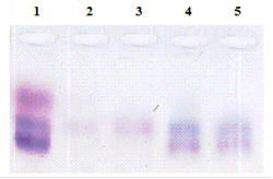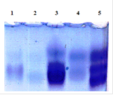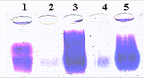 Рис.9. Электрофореграмма протеогликанов 1 - стандартная смесь ГАГ 2 - пациент № 70, контрольная ткань 3 - пациент № 70, опухолевая ткань 4 - пациент № 72, контрольная ткань 5 - пациент № 72, опухолевая ткань В различных буферных системах качество и четкость разделения ПГ на фракции может варьировать. Нам необходимо было подобрать буферную систему, в которой происходит наилучшее разделение фракций ПГ. 3.2 Отработка условий проведения электрофореза протеогликанов в агарозном гелеВыделенные образцы протеогликанов разделяли электрофорезом в различных буферных системах и сравнивали по подвижности со стандартами ГАГ (рис.10). В буфере ТАЕ электрофорез проходит очень быстро (7 мин.), стандарты и пробы не успевают разделиться. Наилучшее разделение ПГ на фракции происходило в буфере 50 мM ацетат бария, pH 5. В последующих экспериментах мы будем использовать именно этот буфер. Таким образом, нами была отработана методика проведения гель-электрофореза протеогликанов, подобран оптимальный буфер для электрофореза.