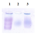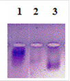 С. электрофорез проводили в буфере 50 м Mацетат бария, pH5 , 50мин. Рис.10. Электрофореграмма ПГ, в различныхбуферных системах 1 - пациент № 40, лимфоузел 2 - пациент № 41, доброкачественная опухоль молочной железы 3 - стандартная смесь ГАГ 3.3 Очистка препаратов протеогликанов от примесей нуклеиновых кислотИзвестно, что в выделяемых препаратах ПГ часто присутствуют примеси нуклеиновых кислот (преимущественно РНК), которые мешают идентификации ПГ (окрашиваются теми же красителями, обладают сходной с ПГ подвижностью). Примесь нуклеиновых кислот удаляли обработкой растворов протеогликанов щелочью или нуклеазами. 3.3.1 Обработка препаратов протеогликанов щелочьюПри щелочной обработке препаратов протеогликанов (см. п.2.2.2.1.) происходит не только удаление примесей РНК, но и отделение ГАГ-цепей от белкового кора ПГ, и в этом случае с помощью гель-электрофореза (рис.11) мы анализируем только состав ГАГ в препарате.