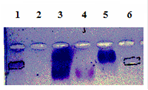 Рис.11. Препараты протеогликанов до и после обработки щелочью 1 - пациент № 45, контрольная ткань 2 - пациент № 45, контрольная ткань + NaOH 3 - пациент № 45, опухолевая ткань 4 - пациент № 45, опухолевая ткань + NaOH 5 - пациент № 40, ткань лимфоузла 6 - пациент № 40, ткань лимфоузла + NaOH После обработки препаратов ПГ щелочью стало ясно, что в них присутствовала значительная примесь нуклеиновых кислот, и дополнительная очистка препаратов необходима. Однако после щелочной обработки происходит нарушение целостности молекул протеогликанов. 3.3.2 Обработка препаратов протеогликанов нуклеазамиОчистка препаратов протеогликанов от примесей нуклеиновых кислот с помощью ДНКазы и РНКазы имеет значительное преимущество перед щелочным гидролизом проб, так как при этом не затрагивается структура протеогликанов. Препараты протеогликанов, выделенных из нормальной и опухолевой ткани молочной железы человека, обрабатывали нуклеазами (см. п.2.2.2.2.). Результаты обработки анализировали с помощью гель-электрофореза (рис.12).