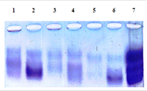 В. Пациент № 54 1 - контрольная ткань 2 - опухолевая ткань 3 - контрольная ткань + хондроитиназа АС 4 - контрольная ткань + хондроитиназа АВС 5 - опухолевая ткань + хондроитиназа АС 6 - опухолевая ткань + хондроитиназа АВС 7 - стандартная смесь ГАГ Обработка хондроитиназой АС удаляла основную массу ГАГ из препарата ПГ опухолевой ткани, что позволяет сделать вывод о появлении в опухолевой ткани хондроитинсульфатов А и С. Также после обработки проб протеогликанов опухолевой ткани хондроитиназой АС значительно уменьшалась и фракция, соответствующая по электрофоретической подвижности дерматансульфатам. Этот факт может говорить о том, что фракция дерматансульфатов в опухолевой ткани претерпевает изменения, которые, однако, не сказываются на ее электрофоретической подвижности. Возможно, в ней снижается степень модификации D-глюкуроновой кислоты в L-идуроновую. 3.6.2 Обработка препаратов протеогликанов азотистой кислотойДля того чтобы идентифицировать присутствие гепарансульфатов, пробы ПГ обрабатывали азотистой кислотой (см. п.2.2.3.2.), результаты обработки анализировали с помощью гель-электрофореза (рис.16).