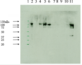 Рис.18. Вестерн-блот с антителами к D-глюкуронил С5-эпимеразе 1 - маркер “Калейдоскоп” 2, 3 - пациент №111 контроль, опухоль 4, 5 - пациент №112 контроль, опухоль 6, 7 - пациент №113 контроль, опухоль 8, 9 - пациент №114 контроль, опухоль 10, 11 - пациент №117 контроль, опухоль Нами были исследованы образцы ткани 20 пациентов, и было показано, что в опухолевой ткани молочной железы человека происходят изменения в структуре D-глюкуронил С5-эпимеразы. У части пациентов в опухолевой ткани данный белок не детектировался, а в контрольной ткани присутствовали дополнительных укороченные фрагменты эпимеразы (100, 75, 40 кДа). У других пациентов экспрессия эпимеразы детектировалась как в контрольной, так и в опухолевой ткани, однако в опухолевой ткани также присутствовали укороченные фрагменты белка. Возможно, такие различия связаны с клиническими диагнозами пациентов. Таким образом, в опухолевой ткани молочной железы человека происходят изменения в экспрессии белковой молекулы D-глюкуронил С5-эпимеразы, что подтверждает наше предположение о возможном участии данного фермента в изменении структуры цепей ГАГ при опухолевом перерождении. ЗаключениеТаким образом, в ходе проделанной работы нами был отработан метод выделения протеогликанов из микроколичеств клинического материала контрольной и опухолевой ткани молочной железы человека и проведен сравнительный анализ содержания ГАГ в нормальной и опухолевой ткани. Данный анализ показал, что в опухолевой ткани молочной железы человека происходит увеличение содержания суммарных протеоглликанов в среднем в 4.3 раза, при пересчете на массу ткани, и в среднем в 2 раза, при пересчете на количество нуклеиновых кислот в ткани, по сравнению с контрольной тканью. Был подобран оптимальный буфер для проведения электрофоретического разделения ПГ. Проведена очистка препаратов протеогликанов от примесей нуклеиновых кислот. Была проведена идентификация фракций протеогликанов, выделенных из контрольной и опухолевой ткани молочной железы 26 пациентов. Было обнаружено, что увеличение содержания ПГ в опухолевой ткани происходит за счет появления в ней значительной фракции хондроитинсульфатов А и С, отсутствующих в контрольной ткани. Также в опухолевой ткани изменена фракция дерматансульфатов, поскольку она частично деградируется ферментом хондроитиназой АС. Факт изменения структуры углеводных частей ДСПГ в опухолевой ткани молочной железы человека был дополнительно подтвержден после определения экспрессии декорина (как наиболее характерного представителя дерматансульфат протеогликанов в тканях млекопитающих) в клинических образцах методом вестерн-блота. Данным методом было показано, что в опухолевой ткани молочной железы человека меняется электрофореточеская подвижность декорина, что может свидетельствовать о нарушении структуры его ГАГ-цепей. Параллельное определение экспрессии D-глюкуронил С5-эпимеразы (фермента, ответственного за созревание ДС-цепей) методом вестерн-блота в тех же образцах ткани показало, что в опухолевой ткани молочной железы человека изменена структура данного фермента, или же его экспрессия не детектируется. Полученные данные служат подтверждением выдвинутой нами гепотезы о возможной роли D-глюкуронил С5-эпимеразы в изменении состава протеогликанов в опухолевой ткани молочн