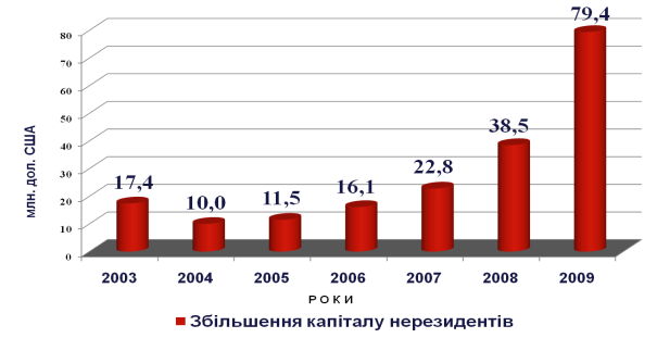 Рис.3.2 Обсяг прямих іноземних інвестицій на 1 мешканця області по рокам Приріст сукупного обсягу іноземного капіталу склав 67,7 млн.дол. США (у 2008 році зменшення становило 21,5 млн. дол. США). Збільшення іноземного капіталу відбулося переважно за рахунок внесків інвесторів у підприємства машинобудівної (63,0 млн. дол. США), харчової (10,0 млн. дол. США) та легкої промисловості (2,0 млн. дол. США), у виробництво будівельних матеріалів (0,5 млн. дол. США). іноземний інвестиція сумський економіка регіон