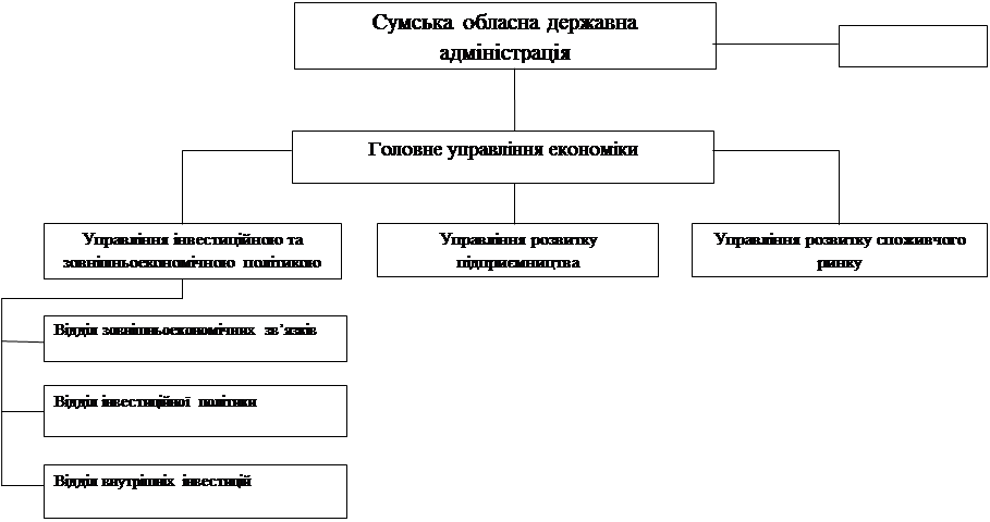 Рис. 2.2 Схема структури управління Головного управління економіки Сумської ОДА 2) виконує роботи з прогнозування та підготовки програм економічного і соціального розвитку; 3) бере участь у формуванні та реалізації державної політики у сфері розвитку економічної конкуренції та обмеження монополізму, проводить моніторинг її реалізації та соціально-економічних наслідків, сприяє розвитку на відповідній території конкуренції, підвищенню ефективності функціонування об’єктів ринкової інфраструктури; 4) бере участь у підготовці пропозицій щодо вдосконалення порядку регулювання цін в окремих галузях, забезпечує реалізацію державної цінової політики; 5) сприяє створенню інфраструктури підтримки регіонального розвитку, умов для рівноправного розвитку всіх форм господарювання та розвитку підприємництва на території області, надає консультаційну, інформаційну та іншу допомогу суб’єктам підприємницької діяльності, розробляє разом з громадськими організаціями підприємців регіональні програми підтримки підприємництва, сприяє їх вирішенню; 6) бере участь у реалізації державної зовнішньоекономічної політики інтеграції України у світову економіку та розширення економічного і соціального співробітництва з ЄС; 7) бере участь у розробленні пропозицій щодо розвитку і поліпшення структури експорту та імпорту товарів (робіт, послуг); 8) бере участь разом з іншими структурними підрозділами в організації участі підприємств та організацій області у виставково-ярмаркових заходах; 9) здійснює в межах делегованих йому повноважень регулятивні і реєстраційно-дозвільні функції; 10) здійснює підготовку відповідних інформаційних матеріалів щодо економічного потенціалу та інвестиційних можливостей області; 11) проводить у встановленому порядку в межах своєї компетенції переговори з офіційними представниками іноземних держав; 12) визначає інвестиційний попит області та на основі визначених державою пріоритетів розробляє пропозиції щодо обсягів державних централізованих капітальних вкладень; 13) розробляє та організовує реалізацію заходів, спрямованих на нарощування інвестиційних ресурсів, створення сприятливого інвестиційного клімату в області; 14) бере участь у роботі щодо залучення інвестицій та кредитних ресурсів на розвиток економічного потенціалу області; 15) бере участь у підготовці пропозицій щодо створення і функціонування спеціальних економічних зон, запровадження спеціального режиму інвестиційної діяльності та територіях пріоритетного розвитку, аналізує економічні та соціальні наслідки функціонування спеціальних економічних зон та територій пріоритетного розвитку; 16) уживає заходів до розширення міжрегіональних економічних зв’язків, готує проекти відповідних угод; 17) аналізує стан і бере участь у розробленні пропозицій щодо розвитку споживчого ринку, ринку послуг та формування їх інфраструктури, поліпшення організації та якості обслуговування населення підприємствами торгівлі, громадського харчування і побуту; сприяє розвитку фірмової торговельної мережі підприємств побуту; 18) готує пропозиції з питань розміщення на території області нових, реконструкції, розширення, діючих підприємств та інших об’єктів виробничого і невиробничого призначення, що належать до сфери управління облдержадміністрації; 19