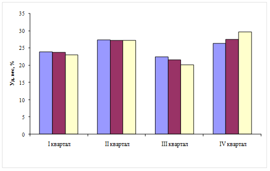 Рис. 2. Динамика объема услуг предприятия Проведенный анализ показал, что деятельность предприятия подвержена значительным сезонным колебаниям. Так пик приходится на IV квартал, а наименьший объем производства наблюдается в III квартале. На анализируемом предприятии можно выделить следующие основные товарные группы: А – материалы для стен и пола; В – лаки, краски; С - электроматериалы; Д- прочие. Далее будем использовать это сокращение для упрощения изложения. Проанализируем структуру и динамику средних товарных запасов по данным товарным группам. Структура запасов представлена в табл. 12. Таблица 12. Структура средней стоимости запасов