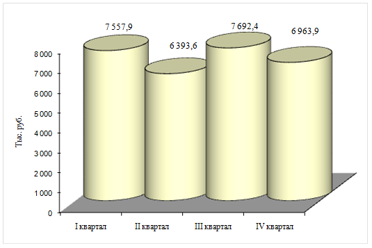 Рис. 3. Товарные запасы ООО “Атриум” Расчеты еще раз подтвердили эффективность и своевременность внедрения предложения по плановому нормативу на предприятии, так как на сегодняшний день необоснованно отвлеченные на пополнение товарных запасов денежные средства составляют в среднем 6 963,9 тыс. руб. Высвобождение денежных средств по периодам представлено на рис. 4.