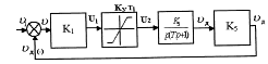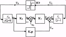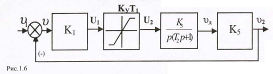 Рис. 1.6 Согласно этой схеме дифференциальное уравнение линейной части системы при V1 (t)=0 запишется в следующем виде: (T2 p+1)pU1 =-kЛ U2 (1.20) где kЛ =k1 k3 k5 Дифференциальное уравнение нелинейного звена имеет вид: (T1 p+1)U2 =ky U1 (1.21) Коэффициент усиления усилителя ky является нелинейной функцией, заданной графически (рис. 1.5). Поэтому согласно методу гармонической линеаризации, запишем для него гармонически линеаризованное выражение