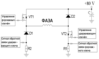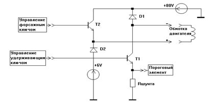 В старом приводе ПШД5/80 питание обмотки двигателя осуществлялось от источника напряжения 6 V. Такое значение напряжения питания было выбрано из тех соображений, что максимальный ток, который может протечь через обмотку, не будет превышать максимального значения, определенного характеристикой двигателя (3 А). Но при таком питании обмотки, достижение током этого значения будет происходить бесконечно долго. Поэтому, для накачки тока в старом приводе использовалось высокое напряжение питания – 80 V. Принципиальная схема такого стабилизатора тока изображена на рисунке 8.