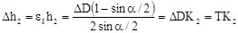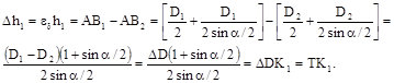 Рис. 49. Схема для визначення похибок базування валів Величину похибки базування визначимо з рис. 49, на якому показане послідовне встановлення в призму оброблюваних валів із найбільшим D1 та найменшим D2 граничними розмірами. Визначимо відстань Δh1 між верхніми точками граничних діаметрів валів, відстань Δh2 між нижніми точками граничних діаметрів валів і відстань Δh між осями. Зазначені відстані є похибками базування відповідних розмірів валів при встановленні за схемою, зображеною в табл. 2. За геометричною побудовою (рис. 49) похибки базування будуть рівними: