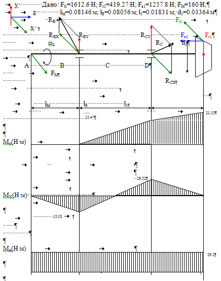 б) Строим эпюру изгибающих моментов относительно оси X MA =0; MB =0; MC =RBY ∙lБ ; MD =RBY ∙(lБ +l1 )+RCY ∙l1 ; MD =Fa 1 ∙d1 /2 2. Вертикальная плоскость а) определяем опорные реакции