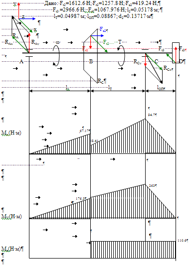 б) Строим эпюру изгибающих моментов относительно оси X MA =0; MB =RAY ∙l2 ; MD =0; MC =-Fr 3 ∙lОП ; MB =Fr 3 ∙(lОП +lT )-RCY ∙lT ; 2. Вертикальная плоскость а) определяем опорные реакции