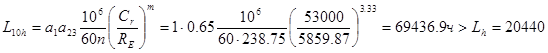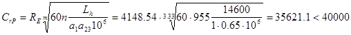 Подшипник подходит Тихоходный вал (подшипник 7507 d=35 D=72 Cr =53000Н Y=1.733) а) Коэффициент влияния осевого нагружения e=0.346 б) Осевые составляющие RsA =1047.54 RsC =1402.36 в) Осевые нагрузки подшипников RaA =982.96 RaC =1402.36 г) Отношения RaA /VRA =982.96/3647.7=0.269<e RaC /VRC =1402.36/4883.23=0.287<e Для AREA =VRA Kб KТ =1∙3647.7∙1.2∙1=4377.24 Для CREC =VRC Kб KТ =1∙4883.23∙1.2∙1=5859.87 Кб =1.2 по таблице 9.4 [1] (Кратковременные перегрузки до 125% от расчетной нагрузки) Более нагруженный подшипник C