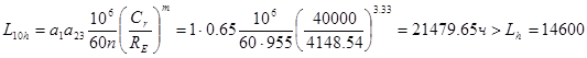 RaA Нагружение подшипников Fa 2 -RaC +Ra А =0 RaC =RsC =RC ∙e∙0.83=4883.23∙0.346∙0.83=1402.36 Н Ra А =-Fa 2 +RaC =-419.4+1402.36=982.96 H RsA =RA ∙e∙0.83=3647.7∙0.346∙0.83=1047.54 Н 9.2 Расчет по динамической грузоподъемностиБыстроходный вал (подшипник 7306 d=30 D=72 Cr =40000Н Y=1.780) а) Коэффициент влияния осевого нагружения e=0.34 б) Осевые составляющие RsA =200 RsB =608.3 в) Осевые нагрузки подшипников RaA =200 RaB =1457.8 г) Отношения RaA /VRA =200/708.34=0.282<e RaB /VRB =1457.8/2155.6=0.676>e Для BREB =(XVRB +YRaB )Kб KТ =(0.4∙1∙2155.6+1.78∙1457.8) ∙1.2∙1=4148.54 Для AREA =VRA Kб KТ =1∙708.34∙1.2∙1=850 Кб =1.2 по таблице 9.4 [1] (Кратковременные перегрузки до 125% от расчетной нагрузки) Более нагруженный подшипник B