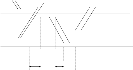 J=(lп +3 *lбл )/Vх Для однопутного участка J=(821 +3*1900) *0,06 / 55,26 = 7,08 = 7 мин. Для двухпутного участка J=(821+3*2200)*0,06/ 64,53 = 6,9 =7 мин -5. Интервал скрещения 1 мин. Грузовые поезда прокладываем со средним интервалом Iср =(1440-tтехн )/nпр , где nпр - условное число “ниток” грузовых поездов, где пакет из двух поездов на однопутном участке считается за одну “нитку”. tтехн - технологические окна: на однопутном участке - 60 мин., на двухпутном - 120 мин. На однопутном участке прокладываем по четыре пакета поездов в четном и нечетном направлениях. В каждом пакете по два грузовых поезда. Тогда число “ниток” будет nпр =23-4=19 Iср =(1440-60)/19= 73 мин. Размеры движения на двухпутном участке: nпр =63 поезда Iср =(1440-120)/63=21 мин. 4.3 Определение наличной пропускной способности перегонов Пропускной способностью железнодорожной линии называются наибольшие размеры движения (в поездах или вагонах), которые могут быть выполнены на этой линии в течении определенного периода (суток или часа) в зависимости от имеющихся постоянных (стационарных) устройств, типа и мощности тяговых средств, рода вагонов и способа организации движения (типа графика). Наличная пропускная способность - при существующем техническом оснащении линии и принятом способе организации движения. Наличная пропускная способность определяется путем деления суточного бюджета времени на период графика. Периодом графика на однопутной линии называется время занятия перегона парой поездов. Произведем выбор наивыгоднейшей схемы прокладки грузовых поездов на однопутном ограничивающем перегоне – труднейший 4, т.к. время хода по нему пары поездов максимальное (19 мин). Для расчета пропускной способности выбирается минимальный период графика из четырех возможных вариантов 1. Оба поезда пропускаются с ходу на ограничивающий перегон.