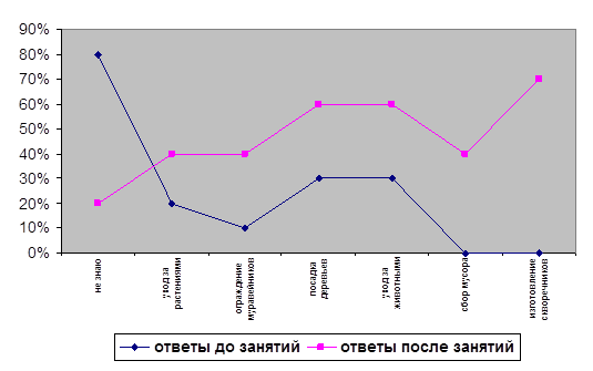 Вывод по главе II Итак, мы рассмотрели в данной главе вопросы экологического воспитания дошкольников в процессе ознакомления с природой Родного края. Выяснили, что работа воспитателя по ознакомлению с природой детей подготовительной к школе группы направлена в основном на углубление полученных ими ранее знаний, на формирование более полных и точных представлений о сезонных изменениях в природе, на уяснение некоторых новых, неизвестных детям связей и закономерностей. Целенаправленно проведенные наблюдения, экскурсии на природу, закрепление воспринятого в последующих беседах, детском рассказывании подводят ребят к пониманию некоторых связей и зависимостей в неживой природе, к пониманию зависимости изменений в неживой природе. Постоянное наблюдение за явлениями неживой природы невозможно без организации уголка природы в ДОУ. Главная особенность и преимущество уголка природы – непосредственная близость его обитателей к детям. Это позволяет воспитателю на протяжении всего учебного года использовать его для проведения различных эколого-педагогических мероприятий и организации разной деятельности с дошкольниками. При наличии даже небольшого пространства уголок природы целесообразно иметь в каждой возрастной группе. Расположить его можно в групповой комнате, раздевальном помещении. Последний вариант особенно хорош – растения и животных будут видеть родители, вместе с детьми наблюдать за ними, обсуждать разные моменты, связанные с их жизнью. Родители смогут увидеть, как дети трудятся в уголке природы, что немаловажно для единства воспитания дошкольников в семье и детском саду. Проведенное нами экспериментальное исследование показало, что после проведения с детьми занятий по формированию природоведческих знаний, уровень знаний детей о растительном и животном мире Забайкалья существенно повысился, что наглядно видно в представленных диаграммах. Заключение Для развития мышления и речи ребенка необходим богатый чувственный опыт, получаемый им от восприятия различных предметов, мира природы, общественной жизни. Экологическое воспитание - новая категория, которая непосредственно связана с наукой экологией, различными ее ответвлениями. Каждое знакомство с природой – урок развития детского ума, творчества, чувства. Целью экологического воспитания дошкольников является воспитание основ экологической культуры личности. Первоначальные элементы экологической культуры складываются на основе взаимодействия детей под руководством взрослых с предметно-природным миром, который их окружает; растениями, животными, их средой обитания, предметами, изготовленными людьми из материалов природного происхождения. Конечно, правильное обращение ребенка с животным, само по себе не решит всех проблем воспитания. Чтобы развитие мышления ребенка при ознакомлении с природой достигло возможного более высокого уровня, необходимо целенаправленное руководство воспитателя этим процессом. Экологическое воспитание детей дошкольного возраста предполагает: o воспитание гуманного отношения к природе (нравственное воспитание) o формирование системы экологических знаний и представлений (интеллектуальное развитие) o развитие эстетических чувств (умение видеть и прочувствовать красоту природы, восхититься ею, желания сохранит