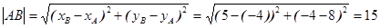 Замечание : после Шага 2 получили нормальное уравнение прямой, т.е. множители при x и y - это значения косинуса и синуса соответственно , а потому они не могут быть больше единицые (по абсолютной величине). Пример 10 (нахождение длины стороны треугольника) Треугольник АВС задан своими вершинами А(- 4; 8), В(5; - 4) и С(10; 6) (рис.17). Найти длину стороны АВ.