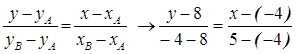 Ответ : длина стороны треугольника АВС равна 15 ед. Пример 11 (нахождение уравнения стороны треугольника) Для треугольника из Примера 10 найти уравнение стороны АВ. Решение «Уравнение стороны» - это уравнение прямой, проходящей через точки А и В. Для его создания используем выражение для нахождения уравнения прямой, проходящей через две данные точки :