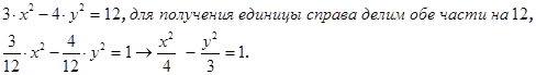 и, окончательно, получаем Ответ Искомая гипербола описывается каноническим уравнением x2 - y2 = 1. Пример 20 (прямая и гипербола) Через точку М(0; - 1) и правую вершину гиперболы 3∙x2 - 4∙y2 = 12 проведена прямая. Найти вторую точку пересечения прямой с гиперболой. Решение Задачу будем решать в два шага: - найдем уравнение прямой; - найдем координату точки пересечения прямой и гиперболы. Шаг 1 Для нахождения уравнения прямой, проходящей через точку М(0; - 1) и правую вершину гиперболы необходимо знать координаты правой вершины гиперболы. Найдем вторую точку из уравнения гиперболы, приведя данное уравнение к каноническому виду, зная при этом, что в каноническом уравнении важно все: равно выражение именно единице, а в самом выражении – значения действительной и мнимой полуоси – это знаменатели дробей, в которых числители x2 и y2 .