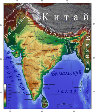 Герб Индии представляет собой изображение «Львиной капители». На гербе изображены четыре индийских льва на круглой абаке[1] . Герб символизирует нацию, которая «отважна в храбрости, сильна в теле, благоразумна в совете и устрашает противников». Абака украшена четырьмя животными — символами четырёх направлений: Лев — севера, Слон — востока, Лошадь — юга и Бык — запада. Абака опирается на лотос в полном расцвете, символизирующий источник жизни (см. рис. 2). Республика Индия располагается в центральной части Южной Азии и занимает большую часть полуострова Индостан [1]. Территория Индии по форме напоминает гигантский треугольник, как бы отгороженный от остальной Азии высокой стеной Гималаев (см. рис.3). Страна занимает седьмое место в мире по площади (3 287 590 км², в том числе, суши: 90,44 %, водной поверхности: 9,56 %) и второе место по численности населения (1 131 191 071 чел.).