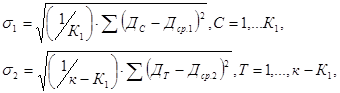где К1 – количество организаций, у которых рыночные доли меньше среднеотраслевого значения; (к-К1) – количество организаций, у которых рыночная доля больше или равна среднеотраслевому значению; Дс – рыночные доли организаций, для которых рыночные доли меньше среднеотраслевого значения; ДТ – рыночные доли организаций, для которых рыночная доля больше или равна среднеотраслевому значению; Дср1 – среднее арифметическое значение рыночной доли организаций, у которых рыночные доли меньше среднеотраслевого значения; Дср2 - среднее арифметическое значение рыночной доли организаций, у которых рыночная доля больше или равна среднеотраслевому значению.