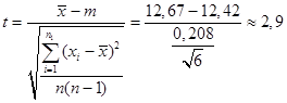 и Таким образом, с вероятностью ошибки 0,05 можно считать, что условия проведения опыта существенно изменились. Задание 3УсловиеВ продолжение задания 1. Можно ли утверждать, что указанные в задании 1 данные говорят о существенном изменении условий проведения опыта, если известно, что для проведения этих наблюдений математическое ожидание рассматривающейся случайной величины составляло 12,42? РешениеУ нас имеется случайная величина X , закон распределения которой близок к нормальному закону. Нам нужно ответить на вопрос: «Справедливо ли, что математическое ожидание X равно заданной константе m , где m = 12,42?» Если нет, то условия проведения нашего опыта существенно изменились. Предполагается, что над случайной величиной проведены n независимых испытаний. Введем оценку математического ожидания для X :