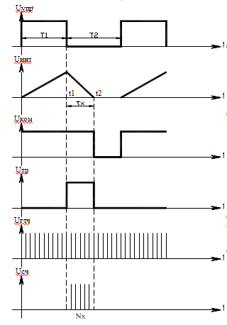 где Uвых – напряжение на выходе интегратора, В; R– сопротивление, Ом; C– емкость конденсатора, Ф; Uвх – входное напряжение, В; t1 – начальный момент интегрирования (момент появления фронта импульса Т1 ); t2 – конечный момент интегрирования. Крутизна этого напряжения пропорциональна входному напряжению Ux. В момент t1 (рисунок 2), когда наступило окончание первого импульса, триггер из состояния «0» перебрасывается в состояние «1» , а электронный переключатель отключает входное напряжение от интегратора и к интегратору подключается источник опорного напряжения. Напряжение на компараторе остается равным «1». И начинается второй такт интегрирования “вниз”, т.к. источник опорного напряжения имеет противоположную полярность по отношению к измеряемому напряжению. Напряжение на выходе интегратора линейно убывает. И в момент t2 , когда напряжение на выходе интегратора будет равно «0», тогда компаратор переключится из состояния «1» в состояние «0». И в этот же момент триггер закроется, т.е. на его выходе будет состояние «0» Во время второго такта, когда триггер открыт, через него проходят импульсы высокой частоты на временной селектор, т.е. во временном селекторе импульс, который приходит с триггера, заполняется импульсами высокой частоты, приходящих с генератора тактовой частоты. Это количество импульсов пропорционально измеряемому напряжению. Начало следующего цикла задается фронтом импульса Т1 . Рис.