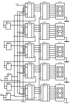 Перепишем (3) в виде: где tи - время управляющего импульса. Так как у нас время измерения равно 0,05с., то время первого такта интегрирования равно : Для более точного расчёта примем Для обеспечения заданной точности измерения (0.008%), входное напряжение должно измеряться с точностью 0,0008В. Следовательно в схеме индикации мы используем 5 индикаторов. Одному вольту входного напряжения у нас соответствует Nx=10000 импульсов. Так как максимальное время измерения Т1=0,02с., то частота счётных импульсов поступающих с генератора равна: