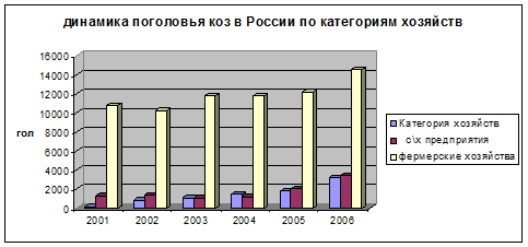 Как было сказано выше, большая часть поголовья молочных коз как и раньше сосредоточена в личных подсобных хозяйствах (68,9%). Видна тенденция увеличения поголовья коз с 2002 года на 4290 головы или 41,9 %, что может быть обусловлено возрастанием потребности в козьем молоке как лечебного продукта, в связи с ухудшением экологической обстановки в стране, увеличением доли пожилых и больных людей, которые не могут по тем или иным причинам потреблять коровье молоко (из-за его непереносимости, аллергии и др.).