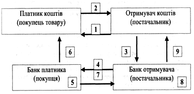Рис. Розрахунок чеком 1 - постачальник передає товар покупцеві; 2 - покупець передає чек постачальнику; 3 - постачальник передає чек у свій банк; 4 - банк постачальника направляє чек для оплати в банк покупця; 5 - банк платника списує кошти з рахунка покупця товару; 6 - банк платника повідомляє платника про списання коштів; 7 - банк платника переказує банку постачальника відповідні кошти; 8 - банк постачальника зараховує кошти на рахунок постачальника; 9 - банк постачальника повідомляє постачальника про зарахування коштів на його рахунок. Чекова форма розрахунків має переваги: відносне прискорення термінів розрахунків і надходження коштів на рахунок постачальника, що сприяє зменшенню дебіторської заборгованості. Недоліками такої форми розрахунків є недостатня гарантія платежу, оскільки на рахунку чекодавця може не бути потрібних коштів; неможливість розрахунків чеками на велику суму; складність оформлення чека. Акредитив - це розрахунковий документ із дорученням однієї кредитної установи іншій здійснити за рахунок спеціально задепонованих коштів оплату товарно-транспортних документів за відвантажений товар. Акредитив — це договір, що містить зобов'язання банку-емітента, за яким цей банк з доручення клієнта зобов'язаний виконати платіж на користь бенефіціара або доручити іншому (виконуючому) банку здійснити цей платіж. Умови та порядок проведення розрахунків за акредитивами обумовлюються в договорі між бенефіціаром і заявником акредитива. Види акредитивів: Покритий – акредитив, який передбачає попереднє депонування коштів. Банк платника списує кошти з поточного рахунку платника і перераховує ці кошти в банк постачальника на окремий аналітичний рахунок Непокритий — це акредитив, оплата за яким у разі тимчасового браку коштів на рахунку платника гарантується банком-емітентом наданням банківського кредиту. Відкличний акредитив може бути змінений або анульований банком-емітентом будь-коли без попереднього повідомлення беніфіціара. Безвідкличний акредитив може бути анульований або умови якого можуть бути змінені тільки за згоди бенефіціара, на користь якого він був відкритий, і банку-емітента. Такий акредитив слід розглядати як тверде зобов'язання банку-емітента сплатити кошти в порядку та в строки, визначені умовами акредитива. Вид акредитива (відкличний чи безвідкличний) зазначається на кожному акредитиві. Коли такої позначки нема, акредитив вважають безвідкличним. Для відкриття акредитива до банку-емітента подається заява за відповідною формою. Для відкриття покритого акредитива, депонованого у виконуючому банку (коли він не є банком-емітентом), крім заяви подається платіжне доручення на перерахування коштів для бронювання їх у виконуючому банку. Акредитив уважають відкритим після того, як здійснено відповідні бухгалтерські записи за рахунками та надіслано повідомлення про відкриття й умови акредитива. Банк-емітент інформує виконуючий банк про відкриття акредитива електронним повідомленням (електронною поштою), а останній повідомляє про це бенефіціара протягом 10 робочих днів. Після відвантаження продукції (ви конання робіт, надання послуг) бенефіціар подає виконуючому банку потрібні документи, що передбачені умовами акредитива. Після ретельної перевірки дотримання всіх умов банк списує кошти з ана