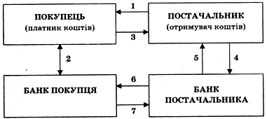 Рис. Розрахунки платіжними дорученнями 1 - постачальник відвантажує продукцію (виконує роботи, послуги); 2 - постачальник виставляє рахунок-фактуру за продукцію, роботи, послуги; 3 - покупець подає до банку, що його обслуговує, платіжне доручення; 4 - банк покупця списує з його рахунка кошти; 5 - банк покупця повідомляє покупця про списання коштів; 6 - банк покупця передає електронним зв'язком або надсилає платіжне доручення на відповідну суму до банку постачальника; 7 - банк постачальника зараховує кошти на рахунок постачальника; 8 - банк постачальника повідомляє постачальника про надходження коштів на розрахунковий рахунок випискою з розрахункового рахунка. Платіжна вимога-доручення - це комбінований розрахунковий документ, який складається з двох частин. Верхня частина - вимога підприємства-постачальника до підприємства-покупця сплатити вартість товару, виконаних робіт чи послуг. Нижня частина - доручення покупця (платника грошових коштів) банку, який його обслуговує, перерахувати належну суму коштів з його рахунка на рахунок постачальника. Цей розрахунковий документ заповнює постачальник (отримувач грошових коштів) і направляє покупцеві (платнику коштів). Покупець (платник коштів), коли він згоден оплатити товар (роботи, послуги), заповнює нижню частину цього документа і направляє його у свій банк (банк, який його обслуговує) для переказу акцептованої суми на розрахунковий рахунок постачальника. Платіжні вимоги-доручення використовуються переважно в міжміських розрахунках за відвантажені товарно-матеріальні цінності, виконані роботи, надані послуги.