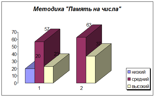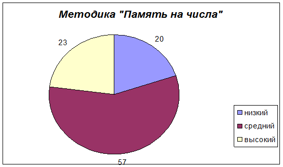 Из таблицы 1 и диаграммы на рис.1 мы видим, что в результате диагностики кратковременной зрительной памяти по методике «Память на числа», большинство шестиклассников имеют средний уровень кратковременной зрительной памяти. У шести школьников уровень памяти низкий. И семь человек имеют высокий уровень памяти по данной методике (см рис.1).