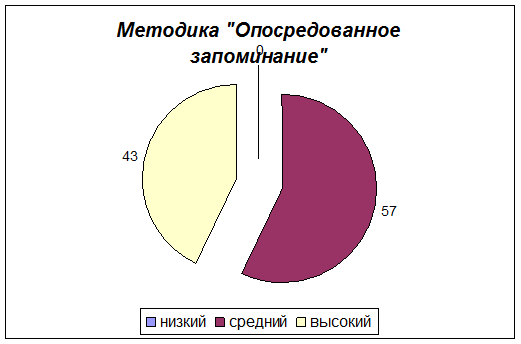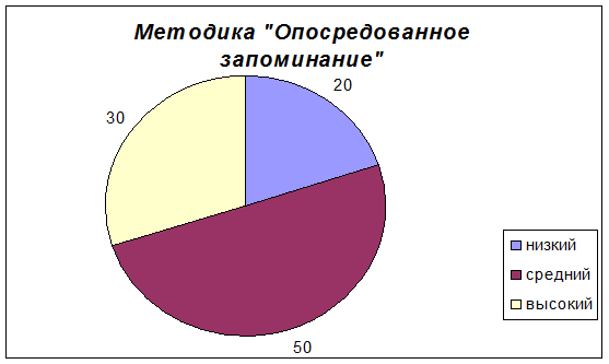 Рис.2. Результаты диагностики произвольного запоминания В результате диагностики опосредованного запоминания выяснилось, что половина школьников имеет средний уровень запоминания, у шести человек уровень запоминания низкий, и у девяти – высокий (см.рис.3).