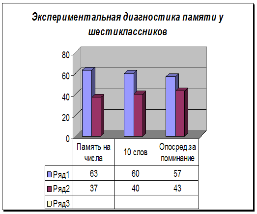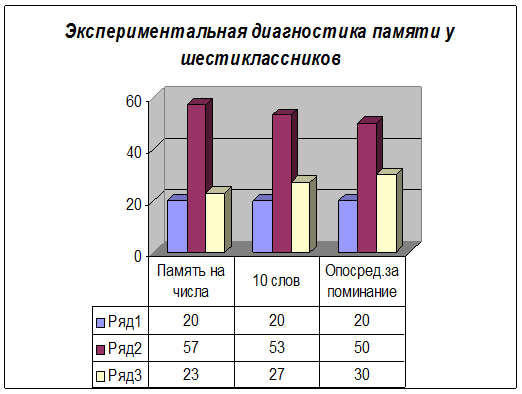 Рис.4. Сравнение результатов экспериментальной диагностики памяти у шестиклассников. Итак, из диаграммы на рис.4 мы видим, что по всем трем методикам большинство школьников имеет средний уровень памяти. Низкий уровень памяти отмечен у 20% шестиклассников. На следующем этапе исследования был проведен формирующий эксперимент. 2.3 Описание формирующего эксперимента После первичной диагностики учащихся мы провели с ними тренинг логического запоминания. Тренинг направлен на формирование и совершенствование у школьников разнообразных приемов смысловой проработки материала, составляющих основу логической памяти. Материал для эксперимента - дидактические игры и упражнения (см. приложение №2). Плохая память у школьников может обусловливаться множеством различных причин. Но чаще всего психологу приходится иметь дело со случаями, когда ребенок попросту не владеет (или недостаточно владеет) способами смыслового запоминания материала, у него отсутствуют умения и навыки их применения в учебно-познавательной деятельности. Ученики занимались ежедневно, 2-3 раза в неделю в течение месяца. Первые занятия проводились под руководством психолога, затем учащийся получал индивидуальные задания по каждому из упражнений и выполнял их в домашних условиях. http://www.voppsyl.ru/4y/ISSUES/1991/916/916083.php - _ftn2 Первоначальное становление, последующее совершенствование и заключительная автоматизация основных приемов смысловой проработки материала приводят к существенному улучшению логической памяти учащихся. При этом у некоторых из них параллельно с освоением способов логического запоминания происходит формирование отсутствовавшего прежде вкуса к умственной работе и восстановление утраченного ранее интереса к учебно-познавательной деятельности. 2.4 Контрольное исследование успешности обучения у детей подросткового возраста После окончания формирующего эксперимента мы провели контрольную диагностику мнестических процессов учащихся для оценки эффективности тренинга логического запоминания (см. приложение 3). Результаты диагностики представлены в таблице 2 и отражены графически в диаграммах. Таблица 2.