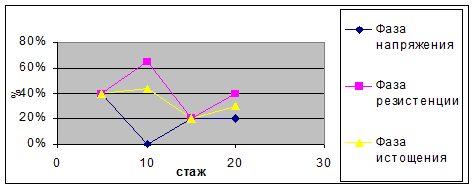 Опишем данные таблицы по каждому симптому. Фаза “напряжение”. Симптом “переживание психотравмирующих обстоятельств” сложился у 70% испытуемых, находящихся в фазе напряжения, еще у 20% учителей этот симптом находится в стадии формирования. Это указывает на то, что обстоятельства на работе, текущие рабочие вопросы становятся причиной раздражительности. Симптом “загнанности в клетку” сложился у 60% испытуемых и у 20% складывается. Учителя описывают это ощущение как невозможность преодолеть организационные недостатки на работе. Симптом “тревоги и депрессии” сложился у 60 %и складывается у 20% учителей, находящихся в фазе напряжения. Симптом “неудовлетворенности собой” сложился у небольшого числа учителей – всего у 9 % и складывается у 20%. Это указывает на то, что учителя не испытывают чрезмерного недовольства собой. Таким образом, в фазе “напряжение” доминирует симптом “ переживание психотравмирующих обстоятельств”. Фаза “резистенция”. Симптом “неадекватного эмоционального реагирования” сложился у 80% и складывается у 12% испытуемых. Учителя, у которых сложился данный симптом, имеют тенденцию к неадекватной эмоциональной избирательности: эмоции становятся способом оценивания личности ученика. Последний воспринимает это как предвзятое отношение к себе, неуважение к своей личности. Симптом “редукция профессиональных обязанностей” характерен для 70% тех учителей, у которых уже сформировалась фаза “резистенции”. Этот симптом проявляется в желании сократить обязанности, облегчить задачу. Симптом “расширения сферы экономии эмоций” характерен для 60% учителей, у 13% этот симптом складывается. Желание держать свои эмоции под контролем учителями этой группы переносится на отношения с родными, друзьями, то есть, на непрофессиональную сферу. Симптом “эмоционально-нравственной дезориентации” сложился у 30% и складывается у 13% испытуемых. Это наименее выраженный симптом в фазе резистенции. Большинство учителей не делит учащихся на “любимчиков - нелюбимчиков”. Фаза “истощение”. В данной фазе наиболее выраженным оказался симптом ‘эмоциональной отстраненности”. Он сложился у 80% учителей. Эти учителя стараются исключать эмоции из профессиональной деятельности. Симптом “личностной отстраненности сложился у 70% учителей. Этот симптом проявляется в частичной или полной утрате интереса к субъекту своей деятельности. Симптом “эмоциональный дефицит” сложился у 60% и складывается у 17% учителей. Учитель с уже сложившимся симптомом чувствует, как эмоции минимизируются в профессиональной деятельности. Но нередки случаи, когда учащается проявление отрицательных эмоций. Симптом “психосоматических и психовегетативных нарушений” сложился у 60% учителей, он является наименее выраженным Далее важно проанализировать, каким образом проявляется синдром эмоционального выгорания у различных групп учителей в зависимости от стажа работы. Анализ данных исследования позволяет выделить следующие группы учителей: - стаж работы 0-5 лет, - стаж работы 5 –10 лет, - стаж работы 10 –15 лет, - стаж работы 15 – 20 лет, - стаж работы более 20 лет Таблица №3