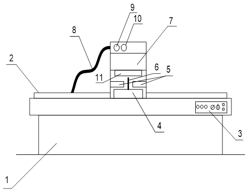 Рис. 1. Загальний вид зварювального станка. 1. Станина. 2. Рейка для пересування зварювального супорта. 3. Пульт управління. 4. Стиковочний стіл. 5. Кутові напрямні. 6. Зварювальний супорт 7. Зварювальна головка 8. Пневмопровід. 9. Показуючий пристрій температури. 10. Показуючий пристрій тиску. 11. Пневмоприжим. Технічні характеристики станка. Діапазон завдання часу оплавлення 0,1-300с Діапазон завдання часу остигання 0,1-300c Напруга живлення ~220 +10-15%, 50 Гц 1-фазної електромережі Максимальна споживана потужність - 1,1 кВт Споживання повітря -250 л/хв. Тиск повітря - 6-8 бар Кут зварювання профілю: Мінімальний - 30° Максимальний - 180° Габаритні розміри: Довжина - 1680 мм Ширина - 580 мм Висота - 1350 мм Маса - 300 кг Робота зварювального станка. Для початку роботи робітник повинен виставити зварювальний супорт на потрібну йому відстань по пересувній рейці. Після встановлення супорта потрібно виставити потрібний кут на кутових напрямних для задання потрібного куту зварювання. Після цього вмикаються станок відповідними кнопками на пульті управління. Робітник встановлює металопрофілі для зварювання в стиковочний стіл, де ці заготовки після їх встановлення фіксуються пневмозатискачем. Разом з притискачем встановлюється зазор між кутовим стиком металопрофілей в 2,0 мм для проходження зварювальної головки яка своїм нагрівом розігріває стик профілей і через деякий час після опускання зварювальної головки пневматика здійснює стикування розігрітих профілей для формування зварювального шва елементів. Після виходу часу остигання пневмоприжим відпускає виріб і робітник забирає його з робочого столу для виконання слідую чого зварювання в такій ж самій послідовності.