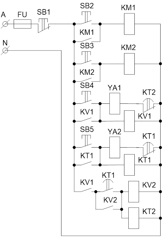 Рис. 10 Циклограма вхідних та вихідних елементів . 2.5 Розробка математичної моделі схеми управління Y=SB1KV8([(SB2+KV1)KV1VD1+(SB3+KM1)KM1SQ1+(SB4+KM2)KM2SQ2+ SPTnor(KV2+SB5)KV3KV2YA1+KV2TMYA2+KT1KV3YA3+(KV3+KV4)KM4KT2VD2)+ (QF2+KV5)KM5VD3+(QF3+KV6)KM6VD4+(KU+KV7)KM7VD7+(KV5+KV6+KV7)KV8 2.6 Розробка схеми електричної принципової Принцип роботи схеми: При натисканні на кнопку SB2 – вмикається рабочий режим станка і запускається двигун пневмонасосу. Робітник натискає на кнопку SB3 – якою при натисненні пересувається супорт вправо через черв’ячну передачу. Крайнє верхнє положення траверси контролюється кінцевим вимикачам SQ1. Кнопкою SB4 – переміщення супорта вліво до спрацювання кінцевого вимикача SQ2. Коли тиск в пневмосистемі має заданий рівень і заготовки вже встановлені в робочій зоні, то робітник натискає на кнопку SB5 – вмикається регулятор температури, котрий вмикає тен та спрацьовує пневмоклапан YA1- пневмозатискач заготовок. Коли нагрівник достатньо нагрітий, то автоматично здійснюється спрацювання пневмоклапана YA2, який піднімає зварювальну головку в місце стику на деякий час, який регулюється реле часу КТ1. Після спрацювання реле часу КТ1 автоматично вимикається пневмоклапан YA2 і вмикається режим стикування заготовок через пневмоклапан YA3 на час охолодження, що регулюється реле часу КТ2. При неполадці чи перевищенні одного з параметрів вмикається сигналізація та вимикається схема управління, а елемент, котрий необхідно полагодити чи перевірити буде сигналізуватися своїм індикатором на світлодіоді.
