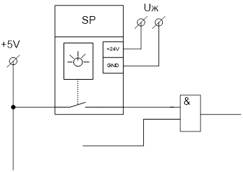 Рис.6.Електрична схема підключення датчика: Досить не сучасним є використання електричних схем на реле. Тому, з використанням сучасних технологій та мінімізації буде використано логічні ІМС Контроль операцій схемою управління буде виконуватися світлодіодними лампами індикації, котрі будуть підключені через логічну розв‘язку мікросхем . Так , як силова схема захищається автоматичними вимикачами, то слід застосувати захист від КЗ шляхом під єднання до логічних мікросхем контактів автоматів. Таким ж чином буде під‘єднуватися реле напруги. Спрацювання цих елементів буде фіксуватися електричною схемою захисту , а та в свою чергу вимикатиме роботу установки та вмикатиме світлову сигналізацію.