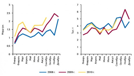 *- за даними [25] Завдяки випереджаючих темпів приросту частка внутрішнього ринку лікарських засобів (виробництво за вирахуванням чистого експорту) неухильно збільшується і в аналізований період склала 26% . Загальний обсяг фармацевтичного ринку, розрахований за формулою «імпорт виробництво - експорт», за підсумками січня-вересня 2010 р. склав 15,1 млрд. грн. за 33,9 тис. т, збільшившись у порівнянні з аналогічним періодом попереднього року на 19,9 і 15,8% відповідно (рис. 1.4). У розрізі помісячного динаміки максимальний обсяг вітчизняного фармацевтичного ринку в грошовому і натуральному вираженні в поточному році відзначений у вересні (рис. 1.5). Ажіотажний попит і, як наслідок, стрімко зросла пропозиція на лікарські засоби в останні місяці 2009 р. в поточному році поставили перед ринком досить непросте завдання з подолання заданої високої планки.
