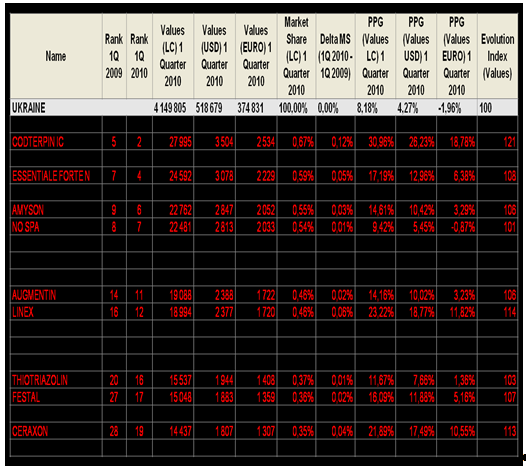 *- за даними [16] За підсумками першого кварталу 2010 року приріст обсягів роздрібного сегменту ринку лікарських коштів у грошовому виразі (гривня) склав «8,18%» по відношенню до першого кварталу 2009, на тлі помірної девальвації національної валюти (середній курс долара виріс на 3,1%, а євро на 9,8%) (додаток 4). Причому позитивні темпи приросту по відношенню до аналогічного періоду минулого року були відзначені за результатами кожного місяця кварталу. Темп приросту при порівнянні з попереднім, четвертим кварталом 2010 року, склав «-11,8%», що багато в чому обумовлено «Епідемічною ситуацією» останнього кварталу минулого року, про яку було вже чимало написано. Варто відзначити, що різниця в ціні між імпортними та українськими ліками колосальна - залежно від категорії товару вона може становити 300-400%, а часом досягати 600-700%. В 2009-му середня ціна на імпортні медикаменти виросла на 67% в порівнянні з минулим роком. При цьому приріст середньозваженої ціни українських препаратів в минулому році склав 34%. Зовсім не збільшувати вартість своєї продукції українські фармацевти не могли, оскільки у виробництві ліків вони використовують імпортну сировину, куплене за валюту. Однак наявність непоганих його запасів дозволило їм підвищувати ціни плавно, уникаючи відчутних стрибків. У результаті вітчизняні компанії змогли помітно наростити обсяги продажів і поліпшити свої фінансові показники. Так, за підсумками 2009 року аптечні продажу Борщагівського ХФЗ збільшилися на 25%, компанії «Інтерхім» - на 32%, «Фармака» - на 16%. А фармацевтична компанія «Дарниця» підвищила показник EBITDA на 52% ($ 41 млн.).[13,c.14] Необхідно зазначити, що через зростання цін ринок лікарських засобів у січні-травні цього року впав у натуральному вираженні на 17-18%. Ємність українського ринку фармацевтичної продукції в січні-травні скоротилася на 90 мільйонів упаковок (до 420 мільйонів одиниць). У сформованих умовах, деякі закордонні виробники знижують ціни. Так, KRKA і Zentiva знизили вартість окремих препаратів до 50%. Ціни на лікарські засоби в Україні постійно зростають. За даними "Фармстандарта", в 2009 році до жовтня ціни на лікарські засоби були на 10-17% вищими від позаторішніх. Так, наприклад, у серпні 2009 року вітчизняні препарати коштували в середньому на 16% (а імпортні - на 13%) дорожче, ніж у серпні 2008-го. Ємність українського фармацевтичного ринку в 2009 році склала. 2,65 мільярда доларів. Тож дивлячись на ціни медикаментів у 2010 році (табл. 1.8) ми бачимо Україні постійно відбувається процес реформування ціноутворення та підходів до регулювання цін на лікарські засоби. З метою вдосконалення механізму утворення цін на лікарські засоби та підвищення рівня доступності лікарських засобів Кабінетом Міністрів України пропонується ряд постанов, спрямованих на забезпечення ефективної реалізації політики утворення цін на лікарські засоби.[32] Табл.1.8 Ціни на окремі лікарські засоби по Україні (за лютий 2010 року)