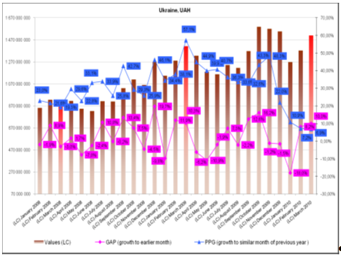 * На діаграмах темп приросту до аналогічного періоду минулого року (PPG) виділена синім кольором. Темп приросту по відношенню до попереднього місяця (GAP) позначено рожевим кольором). |