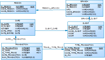 select TRANSACTION.NAME_CLIENT,TRANSACTION.NUMBER_CARD, SUM(TRANSACTION.SUM_TRANSACTION) SUMMA from TRANSACTION where TRANSACTION.IS_FIN = 1 and TRANSACTION.CODE_REGION = ‘001’ and TRANSACTION.DATE_TRANSACTION between ’01.10.2007’ and ’31.10.2007’ GROUP BY CLIENT.NAME_CLIENT,CARD.NUMBER ORDERBY 1,2 3.6 Хранилища данных, как основа интегрированной системыриск-менеджментариск банковский клиент данные обслуживание Использование ХД, как аналитического центра системы управления рисками банка, является естественным развитием процессов автоматизации технологий корпоративного управления. Сегодня многие банки уже эксплуатируют ХД, накапливая в них информацию о планах и результатах своей бизнес-деятельности. Данные используются в целях подготовки управленческой и регламентированной отчетности. Для таких организаций на первом этапе создания системы предстоит только расширить состав интегрируемых данных необходимой информацией для оценки рисков. Кредитные организации, которые изначально будут внедрять ХД для задач риск-менеджмента, в дальнейшем смогут расширить спектр реализации на его базе технологий управления. По соглашениям Basel II банки должны контролировать кредитный риск, рыночные риски (процентный, валютный, фондовый и др.), риск несбалансированной ликвидности и операционные риски. Для этих целей в ХД собирается следующая информация: 1. Данные по договорам с графиками будущих выплат и погашений . Данные используются для прогнозирования потоков платежей, контроля риска ликвидности, расчета процентного риска. Если в исходных системах платежные календари договоров отсутствуют, графики операций генерируются по загруженным договорам инструментами ХД. 2. Данные о курсах валют и данные о ценах инструментов, составляющих торговый и инвестиционный портфели , для оценки валютного и фондового рисков. Точность оценки этих рисков напрямую зависит от глубины выборки, поэтому актуально формировать архив этих данных за несколько лет. 3. Данные по клиентам и данные о совершенных кредитных операциях для расчета кредитных рисков. Кредитный риск определяется по кредитоспособности заемщика и риску кредитного продукта. Для оценки кредитоспособности клиентов в ХД собирается Финансовая отчетность и основные финансовые коэффициенты предприятий-заемщиков, Планы движения денежных средств, Кредитные рейтинги с историями изменений, Кредитные истории (которые могут быть получены из внешних источников или из собственной базы по кредитам, накопленной за некий исторический период). Оценка риска кредитного продукта сводится к определению кредитного спреда, влияющего на конечную цену продукта. Для расчета кредитного спреда в ХД загружается информация о параметрах кредитного договора (срок сделки, стоимость ресурсов), об обеспечении по кредиту, о поддержке третьих лиц в виде гарантий и рекомендаций. 4. Данные для расчета операционных рисков . Для оценки риска на основе подхода, предполагающего выделение типовых направлений деятельности и расчета доли резервируемого капитала в ХД собирается следующая информация: Классификация операций Банка по направлениям деятельности, Данные обо всех операциях Банка для расчета валового дохода каждой операции и направления, База коэффициентов для расчета размера резервируемого капитала и пр. необходимые данные. ХД служит средством сбора данных об операционных сбоях и позволяет накапливать статистику. Перечисленная ин