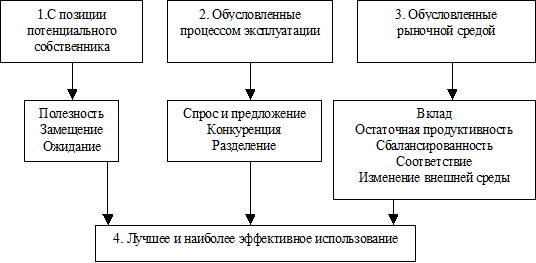 Рисунок 1 – Принципы оценки объектов оценки Первая группа принципов оценки. Исходный принцип оценки стоимости объектов оценки – принцип полезности, который означает, что чем больше объект оценки способен удовлетворить потребность собственника, тем выше его полезность и стоимость. В экономической оценке полезность определяется величиной и сроками получения доходов или других выгод от использования объектов оценки (например, эксплуатация земельного участка в особом режиме – заповедники, лечебно-оздоровительные зоны – или связь объекта с историческими ценностями), а также от престижности. Три подхода к оценке объектов оценки раскрывают различные аспекты полезности. С точки зрения сравнительного подхода рациональный покупатель не заплатит за объект объектов оценки выше цены сопоставимого объекта, обладающего такой же полезностью. С позиций затратного подхода за продаваемый объект оценки нецелесообразно платить больше, чем будет стоить строительство нового объекта аналогичной полезности в приемлемые сроки. С точки зрения доходного подхода стоимость объекта оценки определяется возможностями инвестирования в другие объекты аналогичной полезности, т.е. в объекты, приносящие примерно одинаковый поток доходов. Для некоторых видов объектов оценки наибольшая полезность достигается, если объекты оцениваются как отдельные элементы, другие могут оказаться более полезными в качестве составной части группы (например, многофункциональные центры). Принцип замещения означает, что при наличии определенного количества однородных (по полезности или доходности) объектов оценки самым высоким спросом будут пользоваться объекты с наименьшей ценой. Данный принцип исходит из возможности альтернативного выбора для покупателя, т.е. стоимость объекта оценки зависит от того, имеются ли на рынке аналогичные или замещающие объекты. Принцип замещения связан с установлением верхней границы стоимости объектов оценки, которая обусловлена затратами на строительство заменяющей собственности в приемлемые сроки. Благоразумный покупатель не будет платить за объект оценки больше стоимости незастроенного земельного участка и затрат на строительство аналогичного строения. Принцип замещения наиболее полно реализуется при новом строительстве, в районах массовой жилой или дачной застройки, когда преобладают однотипные земельные участки и высок уровень стандартизации архитектурных и градостроительных проектов зданий. Принцип ожидания определяется тем, какой доход (с учетом величины и сроков получения) или какие выгоды и удобства от использования объекта оценки, включая выручку от последующей перепродажи, ожидает получить потенциальный собственник. Данный принцип лежит в основе оценки доходным подходом и характеризует точку зрения потенциального пользователя на будущие доходы и их текущую стоимость. Например, стоимость земельного участка в населенном пункте, отведенного под жилую застройку, будет отражать капитализированную величину арендной платы (реальной или потенциально возможной), которую ожидает получить собственник от эксплуатации жилого дома. Поскольку использование объектов оценки носит длительный характер, то оценка их рыночной стоимости в конкретном районе должна учитывать перспективные тенденции развития д
