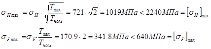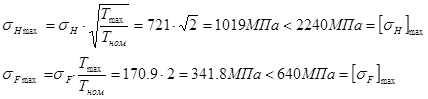 3. Проверка на контактную и изгибную прочность при действии максимальной нагрузки (проверка на перегрузку, на предотвращение пластической деформации или хрупкого излома).