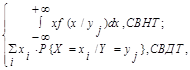 ПР вероятностей отдельных компонент случайного вектора выражаются в виде интегралов от совместной плотности: f(x) = Вероятность попадания случайной точки в произвольную квадрируемую область S на плоскости определяется по формуле P{(X, Y) ÎS}= Условной плотностью распределения вероятностей случайной компоненты X при условии, что компонента Y приняла определенное значение у, называется функция f(x/y) действительной переменной х Î R: f(x/y) = f(x, y)/f(y). Аналогично определяется условная плотностью распределения вероятностей случайной компоненты Y при условии, что компонента X приняла определенное значение x: f(y/x) = f(x, y)/f(x). СВ X1, X2, ..., Хn называются независимыми (в совокупности), если для событий {XiÎ Bi}, i = 1, 2, ..., n, где B1, B2, ... Bn - подмножества числовой прямой, выполняется равенство: P{X1 Î B1, X2 Î B2, ... XnÎ Bn} = P{X1 Î B1}×P{X2 Î B2}× ... ×P{XnÎBn}. Теорема: СВ X1, Х2, .... Хn независимы тогда и только тогда, когда в любой точке x = (x1, x2, ..., xn) имеет место равенство: F(x1, x2, ..., xn) = F(x1) ×F (x2) × ... ×F (xn) (или f(x1, x2, ..., xn) = f(x1) ×f(x2) × ... ×f(xn)). Для двумерного случайного вектора (X, Y) вводятся следующие числовые характеристики. Начальным моментом порядка r + s случайного вектора (X, Y) называется действительное число nr,s, определяемое формулой: nr,s = M[XrYs] = Начальный момент nr,s существует, если интеграл (соответственно ряд) в правой части равенства абсолютно сходится. В частности, nr,0 = M[Xr] - соответствующие начальные моменты компоненты X. Вектор с неслучайными координатами (mX, mY) = (n1,0, n0,1) называется математическим ожиданием случайного вектора (X, Y) или центром рассеивания. Центральным моментом порядка r + s случайного вектора (X, Y) называется действительное число mr,s определяемое формулой mr,s = M[(X-mX)r (Y-mY)s] = Центральный момент mr,sсуществует, если интеграл (соответственно ряд) в правой части равенства абсолютно сходится. Вектор с неслучайными координатами (DX, DY) = (m2,0, m0,2) называется дисперсией случайного вектора. Центральный момент m1,1 называется корреляционным моментом (ковариацией): KXY = M[ Коэффициентом корреляции двух случайных компонентов X и Y случайного вектора является нормированная ковариация rXY = KXY/(sXsY). Свойства ковариации (и коэффициента корреляции): KXX = DX, KYY = DY, (rXX = rYY = 1); KXY = KYX, (rXY = rYX); |KXY|£ Ковариационный момент и коэффициент корреляции определяет степень линейной зависимости между X и Y. Условие |rXY| = 1 необходимо и достаточно, чтобы СВ X и Y были связаны линейной зависимостью Х = a×Y + b, где a и b - константы. СВ, для которых KXY = 0 (rXY = 0), называются некоррелированными. Из независимости случайных величин Х и Y вытекает их некоррелированность (обратное, вообще говоря, неверно). Условным математическим ожиданием компоненты Х при условии, что Y приняла одно из своих возможных значений yj, называется действительное число определяемое формулой: mX/Y = M[X/Y = yj] = где Р{X = xi /Y = yj} = Условной дисперсией компоненты Х при условии, что Y приняла одно из своих возможных значений yj, называется действительное число определяемое формулой: DX/Y = D[X/Y = yj] = Приведенные выше формулы для числовых характеристик двумерного случайного вектора без труда обобщаются на случай n-мерного случайного вектора (Х1, Х2, ..., Хn). Так, например, вектор с неслучайными координатами (m1, m2, ..., mn), где mi - математическое ожидание СВ Хi, определяемое формулой mi = M[Xi] = называется центром, рассеивания случайного вектора. Ковариационной матрицей n-мерного случайного вектора K = где Кij = M[ Оче