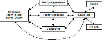 Рисунок 2.2 - Малюнок, який створено в Microsoft Draw Перший напис у рамці створіть у такий спосіб: а) виберіть на панелі Малювання інструмент Напис (кнопка б) намалюйте прямокутник; усередині прямокутника з'явиться курсор; в) установіть шрифт Arial, 10 пунктів, напівжирний; г) наберіть текст напису – слово Поширення; д) відцентруйте набраний рядок; е) мишею за кутовий маркер (квадратик на куті рамки) підберіть розмір рамки, так, щоб слово було видно цілком; ж) виберіть команду ФорматÞНапис й у діалоговому вікні із властивостями напису на закладці Обтікання встановите варіант Немає. Аналогічним образом зробіть ще 6 написів. Потім розташуйте їх так, щоб було зручно з'єднувати рамки стрілками. З'єднайте написи Поширення й Редагування подвійною стрілкою: а) виберіть на панелі Малювання інструмент Стрілка (кнопка б) намалюйте стрілку; в) виберіть команду ФорматÞАвтофігура й на закладці Обтікання встановите варіант Немає; г) на панелі Малювання натисніть кнопку Вид стрілки ( Тепер намалюйте прямі стрілки, що залишилися. Не забудьте відключати у стрілок обтікання текстом, інакше малюнок може розділитися на кілька частин. У будь-який момент ви можете перетягнути початок або кінець стрілки за відповідний маркер розміру. Залишилося намалювати дугоподібну подвійну стрілку. Послідовність дій наступна: а) на панелі Малювання виберіть команду АвтофігураÞЛініїÞКрива; б) клацніть лівою кнопкою в місці, де повинен бути початок стрілки; в) клацніть лівою кнопкою у двох-трьох місцях вигину дугоподібної стрілки; г) у позиції, де повинен бути кінець стрілки, клацніть мишею двічі; д) на панелі Малювання натисніть кнопку Вид стрілки ( Коли малюнок буде готовий, треба настроїти його розмір і потім повернутися в документ. Для цього: а) знайдіть панель інструментів Зміна малюнка ( б) на панелі інструментів Зміна малюнка натисніть кнопку Відновити границі малюнка; в) на панелі інструментів Зміна малюнка натисніть кнопку Закрити малюнок (або виберіть команду ФайлÞЗакрити й повернутися); г) у документі Word відцентруйте малюнок. 2.3 Завдання на підготовку до лабораторної роботи 2.3.1 У режимі попереднього перегляду порівняйте документ зі зразком. Знайдені розходження усуньте. Збережіть документ. 2.3.2 Перевірте, що вище заголовка малюнка й нижче його підпису є по одному порожньому рядку. Якщо немає, додайте їх. 2.3.3 Змініть форматування абзаців основного тексту, встановивши параметри: Вирівнювання: по лівому краю, Міжрядковий інтервал: одинарний Перший рядок: Немає , Інтервал після: 12 пунктів У режимі попереднього перегляду подивіться, як тепер виглядає документ. 2.3.4 Вирівняйте верхній колонтитул по лівому краю й оформіть його курсивом. 2.3.5 Виділите три рядки заголовка й командою ФорматÞРегістрÞВСІ ПРОПИСНІ перетворіть текст заголовків у верхній регістр. 2.4 Варіанти завдань Підготувати текст, що описує географічне положення країни (міста) з попереднього завдання лабораторної роботи №1 з розділу 1.4. Навести ряд прикладів висловлень відомих людей з характеристикою цієї країни (наприклад, вірш), які позначені посиланням на першоджерело. Оформити зв'язок столиці з основними містами країни або показати напрямки авіаліній в інші країни у вигляді схеми. Додати колонтитули у вигляді намальованого орнаменту з відповідним розташуванням по рядку. 2.5 Контрольні запитання 2.5.1 Як вста