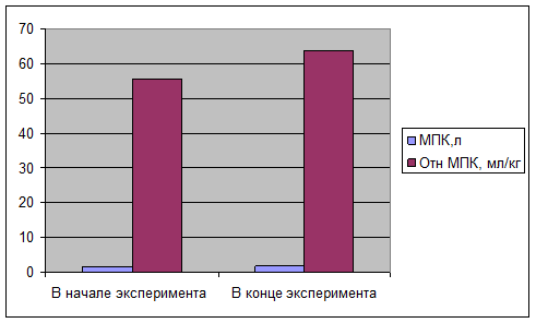 Оптимальная величина в физиометрических показателях мальчиков основной группы объясняется тем, что у них эффективно проявляются результаты внедренных комплексов здоровьеукрепляющих технологий. Следовательно, оздоровительные методики приводят к положительной перестройке основных гомеостатических показателей организма мальчиков. Известно, что индивидуальные антропометрические показатели тела оказывают значительное влияние на функциональное состояние сердечнососудистой системы. В возрасте 9 лет продолжает совершенствоваться нейро-гуморальная регуляция сердечно-сосудистой системы и создаются адаптивные механизмы на воздействие внешней среды (Быков Е.В., Исаев А.П., Сашенков С.Л.,1998). Во время эксперимента мы определили ЧСС у детей контрольной группы, в начале она составила 88,41 уд/мин, у детей основной - 86,21, в конце эксперимента соответственно - 86,81 уд/мин и 81,21 уд/мин, при этом отмечается достоверное снижение у детей основной группы, чем у детей контрольной. Характеристика изменения ЖЕЛ в процессе эксперимента свидетельствует о достоверно более выраженном увеличении ЖЕЛ основной группы на 5,8% после проведения курса ЛФК Расчеты артериального давления по окончании эксперимента показывают, что у мальчиков основной группы показатели пульсового давления выше, чем у представителей контрольной группы. В следующей серии эксперимента пациентам проводилось исследование общей физической работоспособности. Для этих целей использовалась стандартная методика определение МПК степ тест по Астранду. Анализ полученных данных свидетельствует о том, что в начале эксперимента показатели физической работоспособности в обеих группах достоверно не различались, а в конце лечения в экспериментальной группе отмечается достоверное увеличение МПК на 210 мл или на 7,9%, а относительное МПК на 2 мл или на 5,8 %. В то время как в контрольной группе показатели физической работоспособности изменились недостоверно за время исследования (Таблица 7, 8). Показатели физической работоспособности мальчиков 9-10 лет контрольной группы (М±m)
