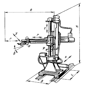 6. Порядок работы на станке После проведения работ по наладке и настройке станка, необходимо: · Определить (предварительно на специальных приборах вне станка или на станке) длину инструмента от торца шпинделя и расстояние от центра стола до обрабатываемой поверхности. Вычислить значение коррекции длины каждого инструмента, и ввести их в УЧПУ в режиме "РВИ". · Определить координаты привязки детали к координатам станка ("нуля" детали к "нулю" станка), проверить их на станке с помощью измерительных приборов и ввести их значения в УЧПУ в режиме "ручная работа". · Ввести в память УЧПУ управляющую программу от пульта в режиме "РВИ" или из перфоленты в режиме "ввод". · Произвести просмотр и редактирование УД в режиме "редактор". · Произвести проверку работы станка по программе на холостом ходу при по кадровой отработке без обрабатываемой детали в ручном режиме. · Пробная обработка детали. 7. Вспомогательное оборудование Одно из основных преимуществ ПР – возможность быстрой переналадки для выполнения задач, различающихся последовательностью и характером манипуляционных действий. Поэтому применение ПР наиболее эффективно в условиях частой смены объектов производства, а также для автоматизации ручного низко квалифицированного труда. Промышленные роботы дают возможность автоматизировать не только основные, но и вспомогательные операции, чем и объясняется постоянно растущий интерес к ним. Вспомогательные (подъемно-транспортные) роботы (ВПР) выполняют действия типа взять – перенести – положить. Их применяют при обслуживании основного технологического оборудования для автоматизации вспомогательных операций установки-снятия заготовок, деталей, инструмента и оснастки, очистки баз деталей и оборудования, питания конвейеров, а также на транспортно-складских и других операциях. Одной из основных причин разработок и внедрения роботов является, конечно, экономия средств. По сравнению с традиционными средствами автоматизации ПР обеспечивают большую гибкость технических и организационных решений, снижение сроков комплектации и пуска в производство автоматизированных систем. Основные предпосылки расширения применения ПР следующие: повышение качества продукции и объемов ее выпуска благодаря снижению времени выполнения операций и обеспечению постоянного режима «без усталости», росту коэффициента сменности работы оборудования, интенсификации существующих и стимулированию создания новых высокоскоростных процессов и оборудования; · изменение условий труда работающих путем освобождения от неквалифицированного, монотонного, тяжелого и вредного труда, улучшения условий безопасности, снижения потерь рабочего времени от производственного травматизма и профессионально-технических заболеваний; · экономия и высвобождение рабочей силы для решения народнохозяйственных задач. Учитывая основные технические характеристики предложенного для модернизации станка ОЦФ-1М выбираем в качестве вспомогательного оборудования промышленный робот РБ-232 (рис.7). 8. Требования, предъявляемые к РТК Основное оборудование должно обеспечивать: · Автоматический цикл обработки детали; · Автоматизированную фиксацию и зажим детали в рабочей зоне станка; · Удаление стружки из зоны обработки; · Возможность очистки оборудования о стружки и грязи; · Обе