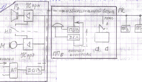 НП – ножная педаль ДИВ – датчик избирательного вызова КП – кнопочный пульт РП – рычажный переключатель ПИВ – приемник избирательного вызова ДКВ – датчик контроля вызова ГК – групповой канал 2) Импульсы тонального избирательного вызова на промежуточном пункте принимаются приемником тонального избирательного вызова, который рассчитан на прием индивидуальной и групповой вызывных комбинаций. Колебательные контуры КК1, КК2 и КК3 настроены на одну из семи вызываемых частот. Так в ПТИВ который включен в группу 3, колебательные контуры настроены на комбинации 6 ,3 ( КК1 настроен на вызывную частоту 3 , а КК2 – на частоту 2). Если же в линию посылается групповая вызывная комбинация 2-1, то одновременно срабатывают все приемники группы (КК2 – на вторую частоту индивидуального и группового вызовов, а КК3 – на, третью частоту группового вызова. 3)Произвести настройку приемника вызова всех промежуточных пунктов, предусмотрев групповой вызов Ж, З, И. Таблица 3.1