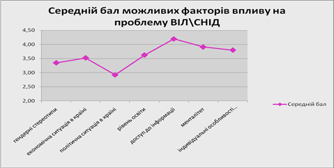 К демонструє таблиця 3.1.4 гендерні фактори не сприймаються респондентами як такі, вплив яких на проблему ВІЛ/СНІД є значним. Це підтверджується даними наведеними в таблиці, де визначаються найбільш впливові фактори на проблему ВІЛ\СНІД, які респонденти мають оцінити за п’ятибальною шкалою. В таблиці зазначаються такі фактори як: гендерні стереотипи, політична ситуація в країні, економічна ситуація в країні, рівень освіти в країні, доступ до інформації (розвиненість ЗМІ), менталітет та індивідуальні особливості кожної людини, пропонувалось оцінити за їхньою важливістю. Гендерні стереотипи отримали достатньо низький бал. Найбільш важливим на думку учасників є доступ населення до інформації ЗМІ та менталітет. На третьому і четвертому місці індивідуальні особливості кожної людини та рівень освіти населення. Одна людина проігнорувала всі фактори, окрім гендерних стереотипів. Результати опитування наведено в таблиці 3.1.3. Таблиця 3.1.3Фактори впливу на проблему ВІЛ/СНІДу